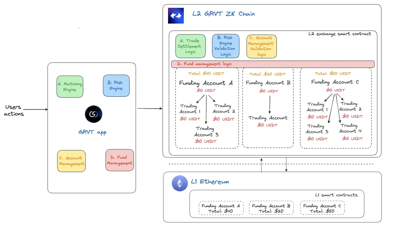 GRVT 采用混合架构:在链下进行撮合与数据存储,同时在链上通过智能合约保证执行的有效性。此架构旨在通过链下处理交易来提高吞吐量,从而减少对以太坊主网的负担。