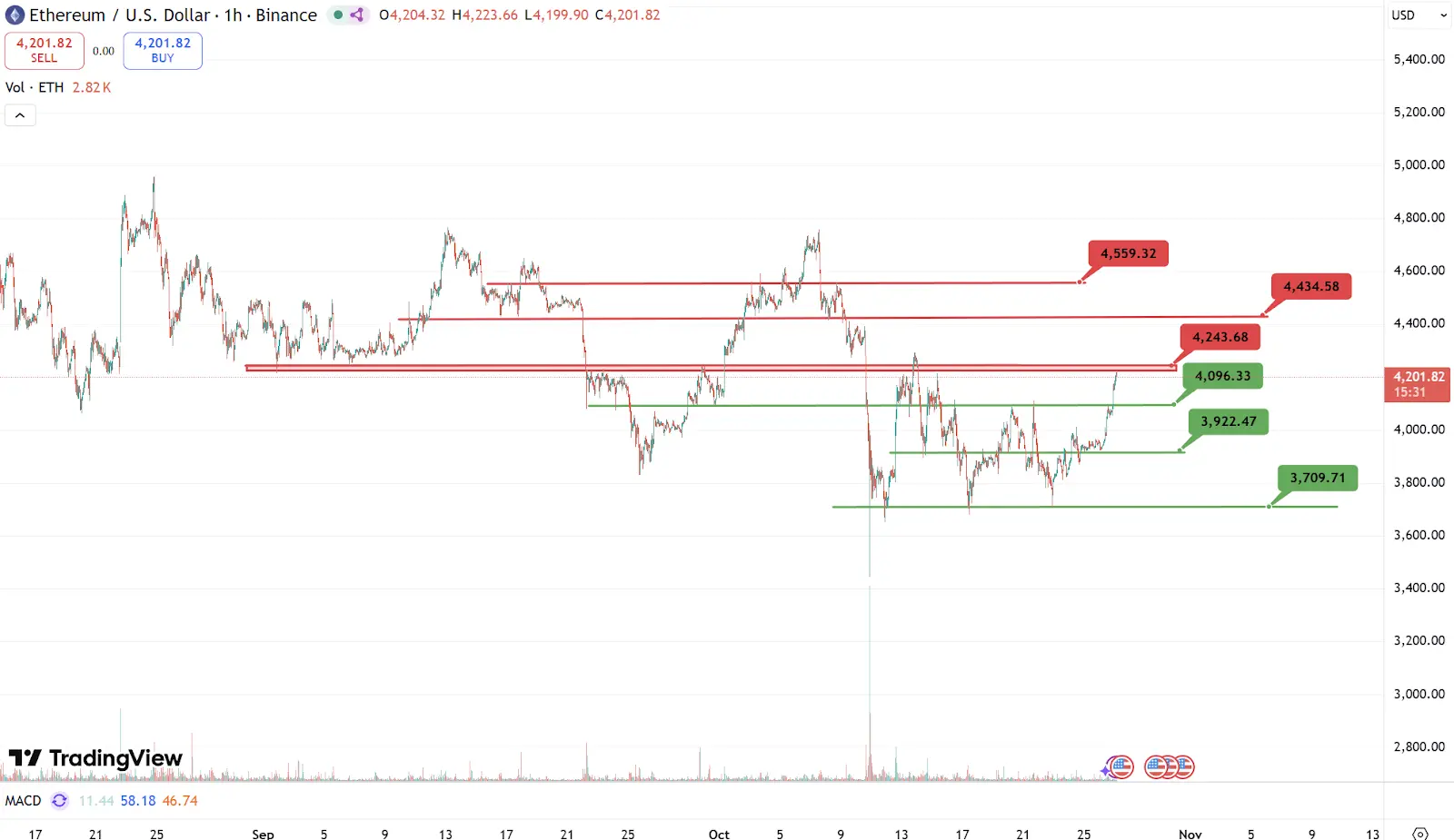 本周重点阻力:4240美元,4430美元,4560美元