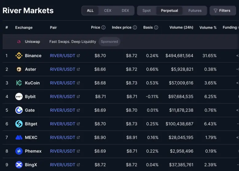 优势二:各大交易所均上线 $RIVER 合约,套期保值便捷