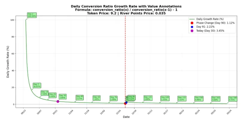 假设当前处于第 30 天,其转换比例较第 31 天高出 3.45%。若今日您的 River Point 可兑换 10,000 $RIVER,明日则可兑换 10,345 $RIVER。
