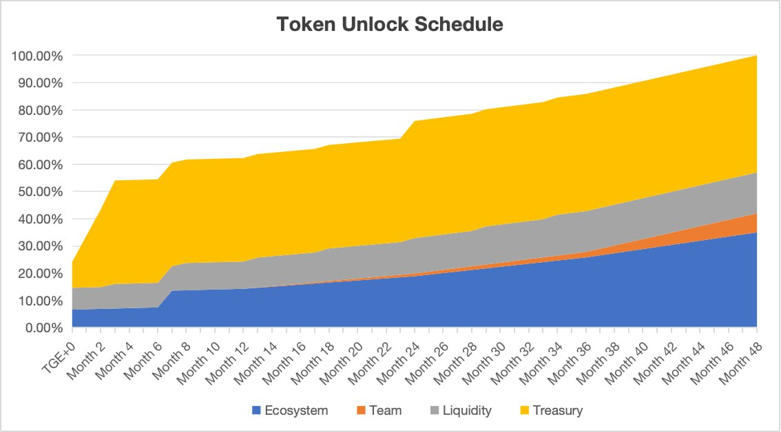 这个分配有几个亮点。首先,社区能够获得的部分,35%的生态激励加上15%的流动性,加起来达到了总量的50%。