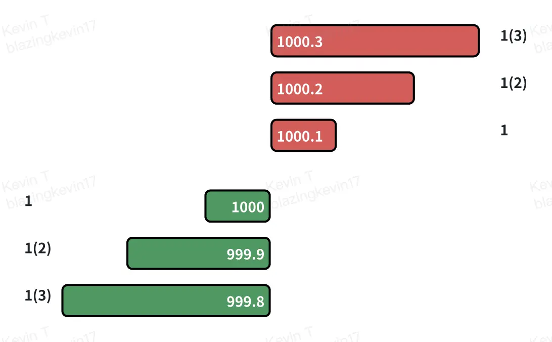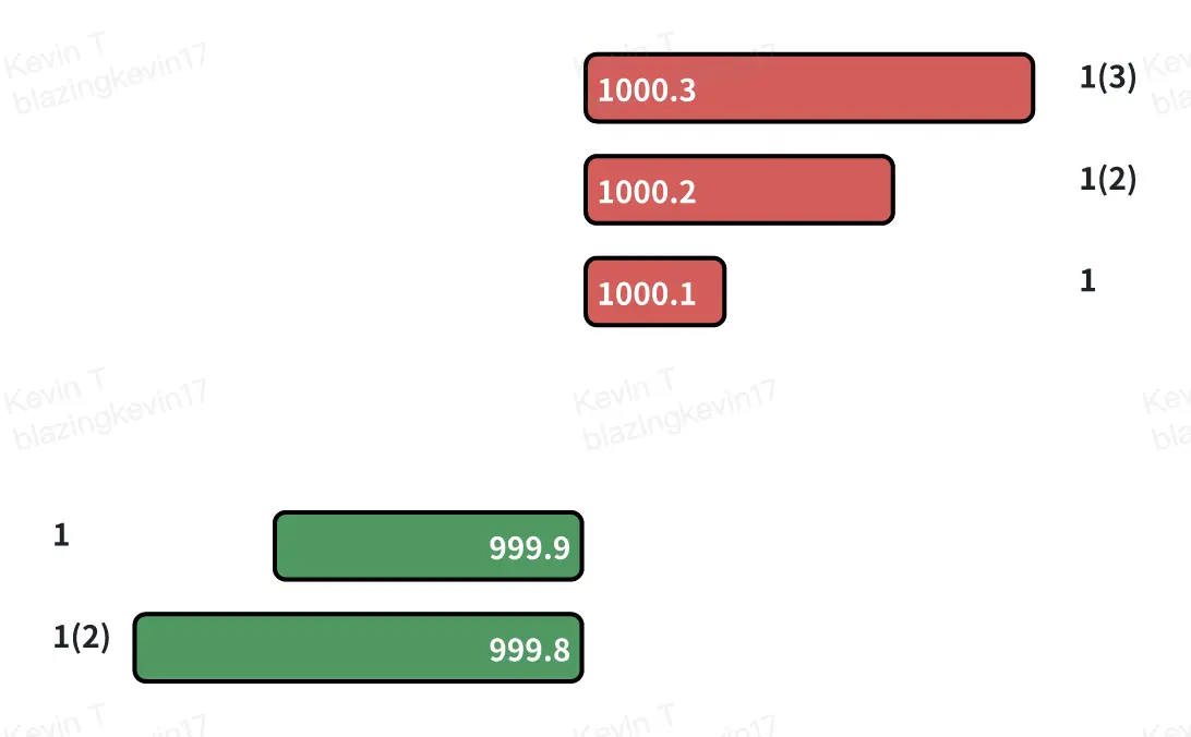• 当前价差 (Spread): 最优买价 ($1000.0) 与最优卖价 ($1000.1) 之间的差额为 $0.1。