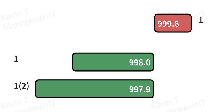 • 方案三:扩大价差,管理现有头寸 做市商可以采取非对称的报价策略:将卖一报价调整至一个相对不具吸引力的价位(如图 $998.8),同时将新的买单挂在更低的价位(如 $998.0 和 $997.9)。 此策略的目标是通过后续的交易来管理并降低现有头寸的平均成本。