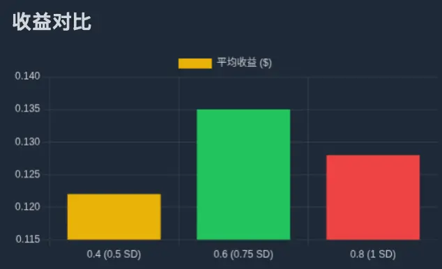 • C. 寻找最优解 通过对不同价差进行迭代计算,可以发现:价差 $0.2 预期收益约 $0.08;价差 $0.4 预期收益约 $0.122;价差 $0.6 预期收益约 $0.135;价差 $0.8 预期收益约 $0.128。结论是在此模型下,最优价差为 $0.6,即在距离均价 $0.3 (约 0.75σ) 的位置挂单,能实现期望收益的最大化。