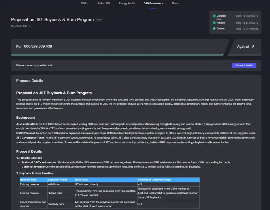 10月21日晚(SGT),波场TRON生态核心借贷协议JustLend DAO社区就“JST回购销毁”提案完成投票,最终以高额赞成票正式通过,标志着JST的通缩机制正式落地执行。