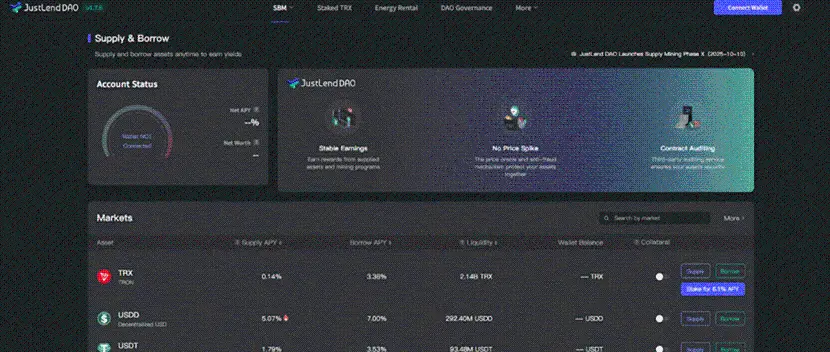 正如JUST去年3月发布的《JUST生态系统概述与规划》中所明确的,JUST已围绕核心借贷协议JustLend DAO构建了“借贷 质押 能量租赁”等复合型服务体系。用户无需切换多平台,仅在JustLend DAO单一协议内就可完成“存借生息 质押挖矿 能量租赁交易”等多样化链上操作,彻底打破传统DeFi“多平台切换”的低效壁垒。