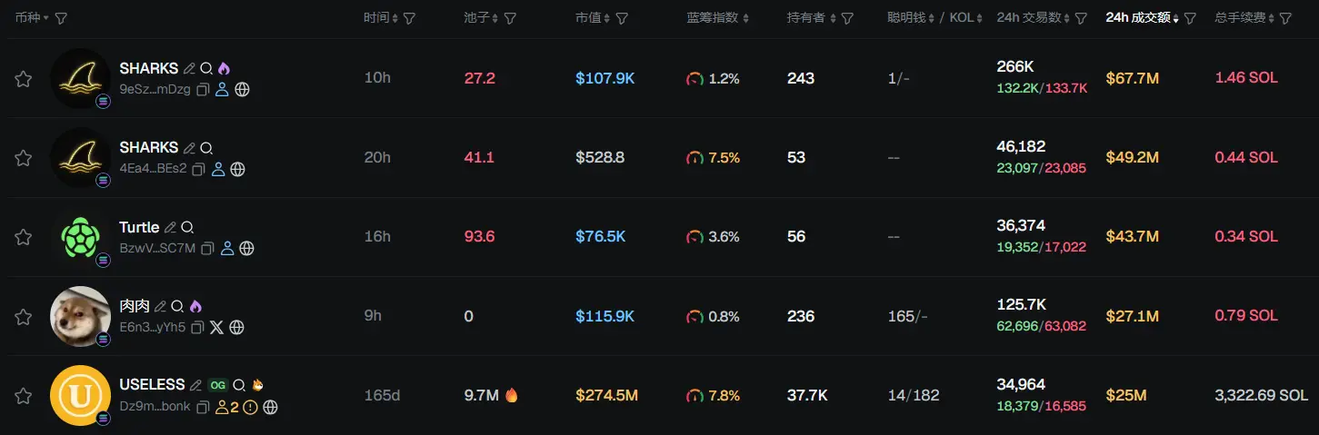 过去 24h Solana 热门代币前五依次为:SHARKS、SHARKS、Turtle、肉肉、USELESS