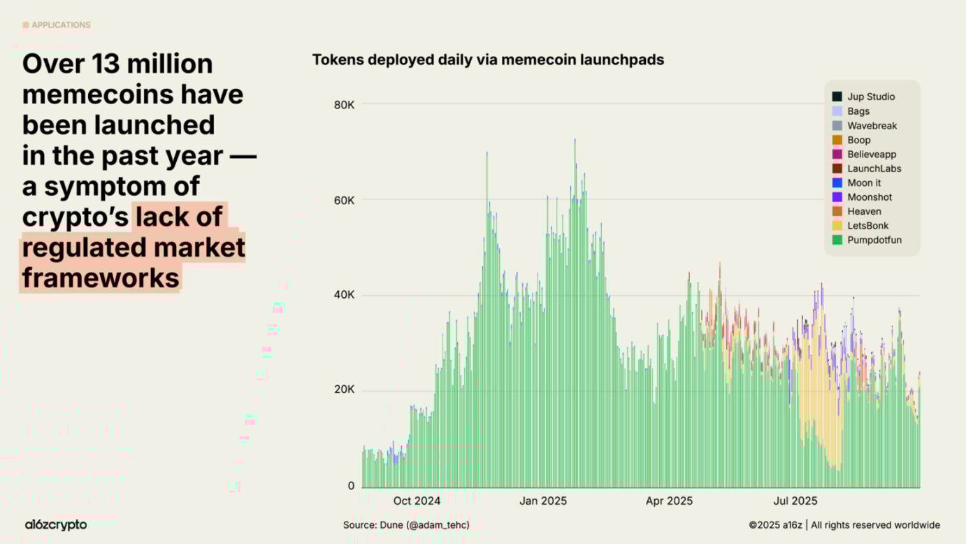 在监管尚未明确的阶段,Memecoin 曾一度繁荣:过去一年,新增 Memecoin 超 1300 万种。但近几个月这一趋势逐渐降温,9 月 Memecoin 发行量较 1 月下降 56%。随着合理政策与两党立法为更具实际价值的区块链用例铺路,Memecoin 的热度正被更有意义的应用取代。