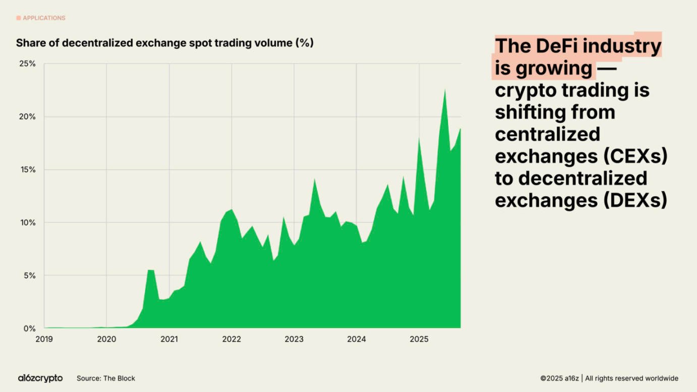 曾经,链上经济只是早期采用者的小众领域;如今,它已发展为覆盖多个行业、月活跃用户数千万的大型市场。目前,近五分之一的现货交易量来自去中心化交易所(DEX)。