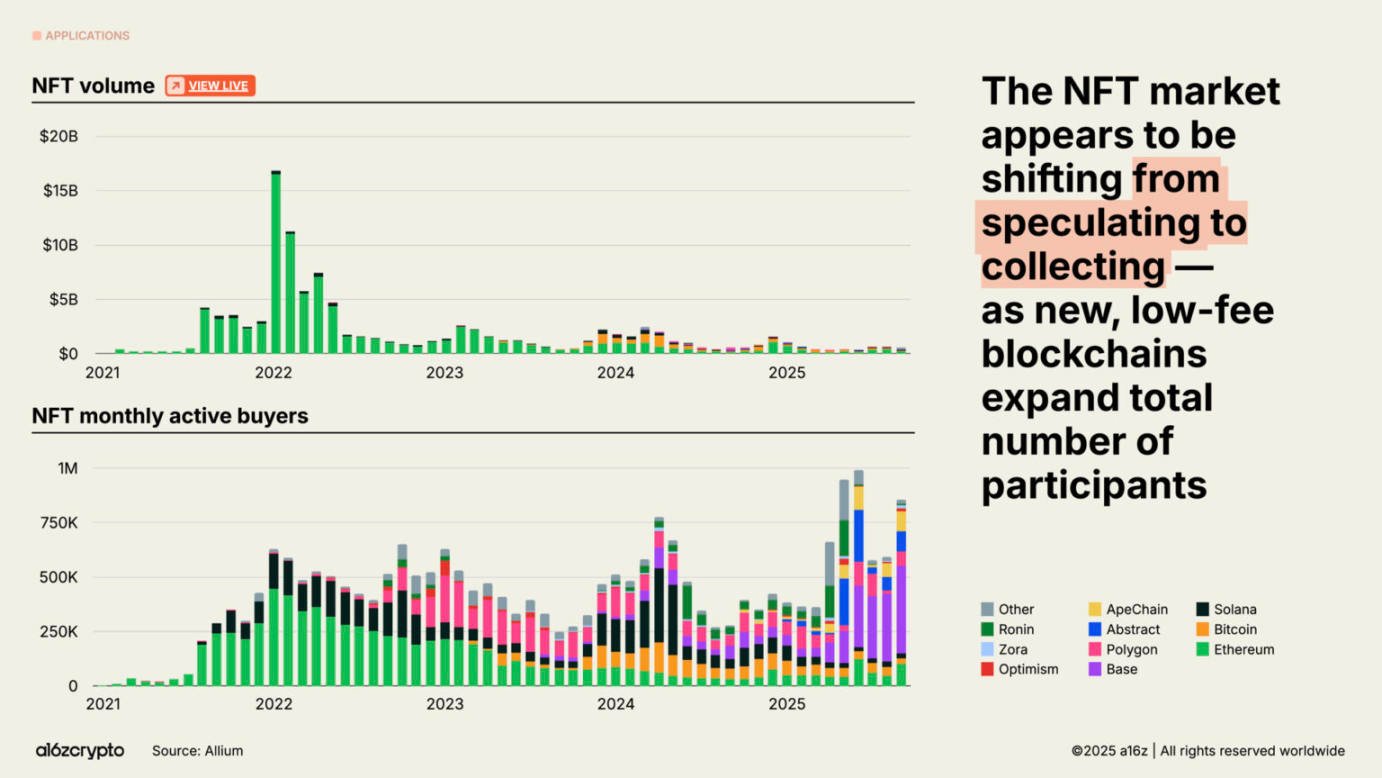 NFT(非同质化代币)市场交易量虽远未达到 2022 年的峰值,但月活跃买家数量持续增长。这一趋势表明,消费者行为正从投机转向收藏。 这一转变的背后,是 Solana、Base 等公链低成本区块空间的普及。