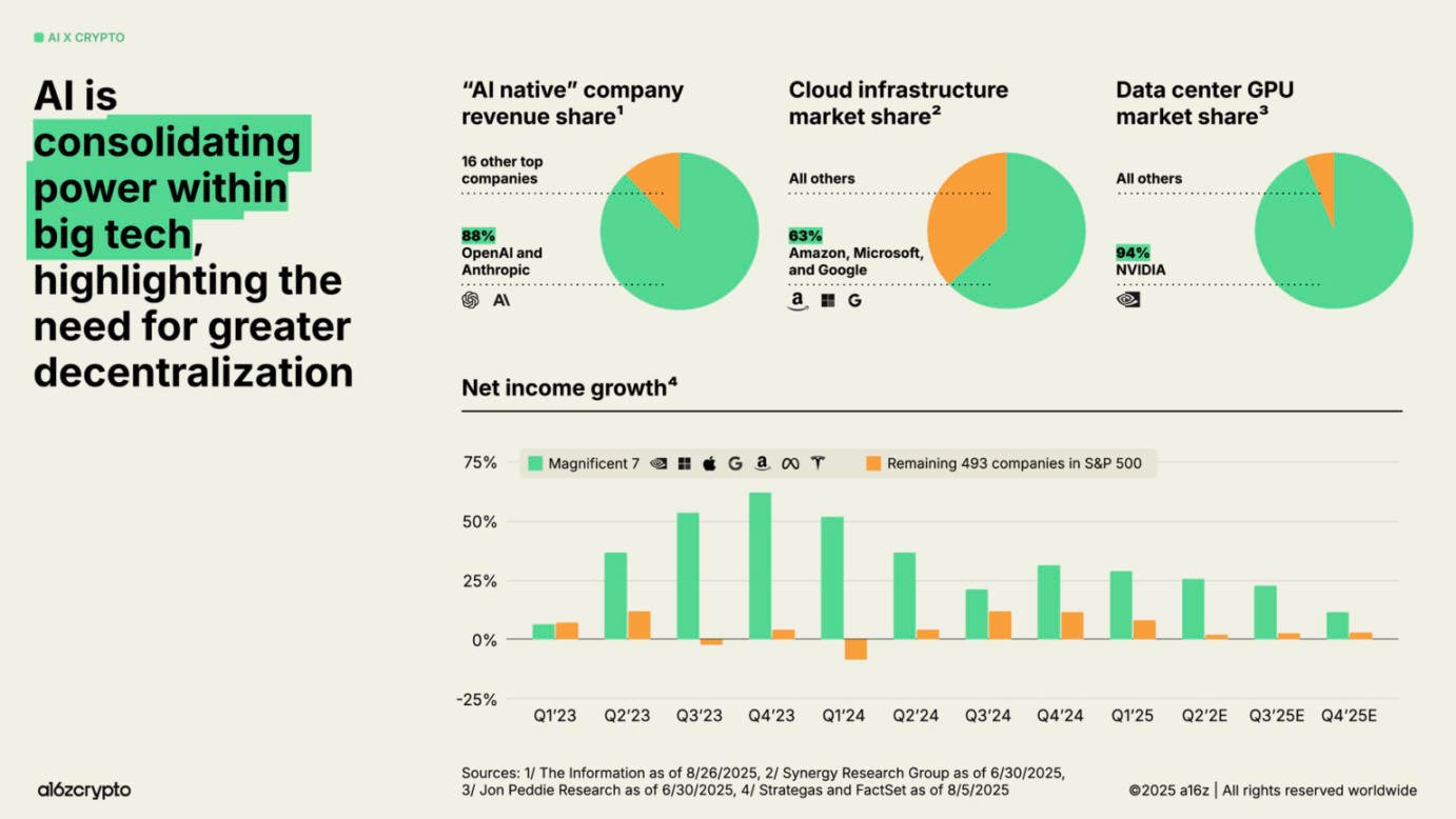 当前,AI 的计算层正逐渐向少数科技巨头集中,引发 「中心化」 与 「审查风险」 担忧。OpenAI 和 Anthropic 两家公司控制着「人工智能原生」公司 88% 的收入。亚马逊、微软和谷歌控制着 63% 的云基础设施市场,而英伟达则占据了 94% 的数据中心 GPU 市场。这些失衡推动了「七巨头」在过去几年中实现了两位数的季度净收入增长,而标普其余 493 家公司的整体盈利增长却未能跑赢通胀。