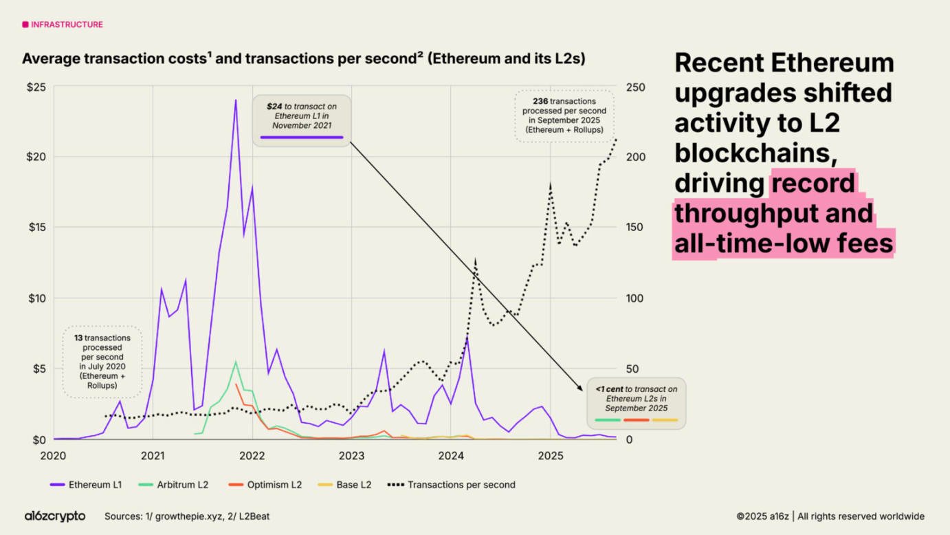 以太坊继续推进扩容路线图,其大部分经济活动正在迁移至 Arbitrum、Base 和 Optimism 等 Layer 2 层。Layer 2 层使以太坊的平均交易成本已从 2021 年的约 24 美元降至如今的不到 1 美分,以太坊链接的区块空间变得廉价且充足。