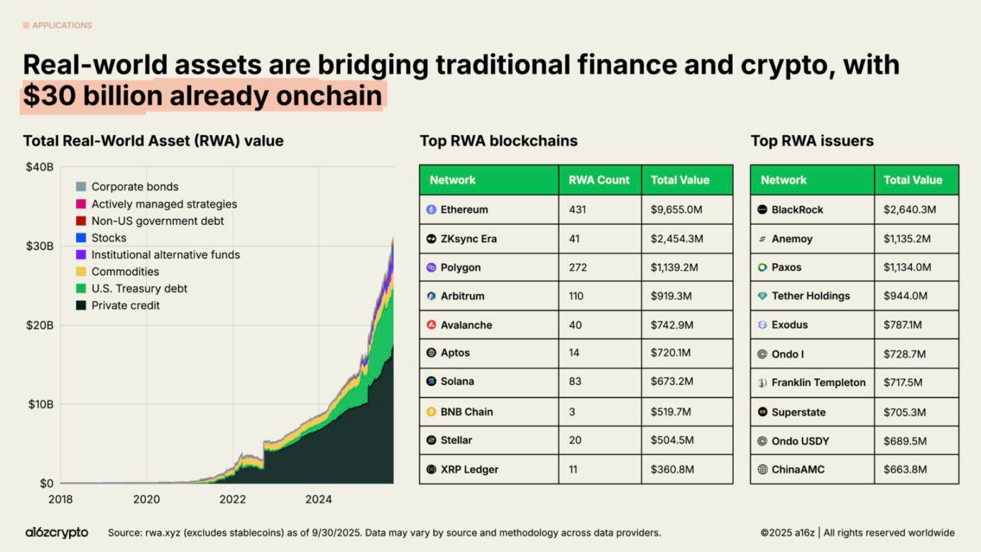 现实世界资产(RWA)——例如美国国债、货币市场基金、私人信贷和房地产等传统资产在链上呈现——连接着加密货币和传统金融。代币化 RWA 的总市场规模为 300 亿美元,在过去两年中 增长了近 4 倍。