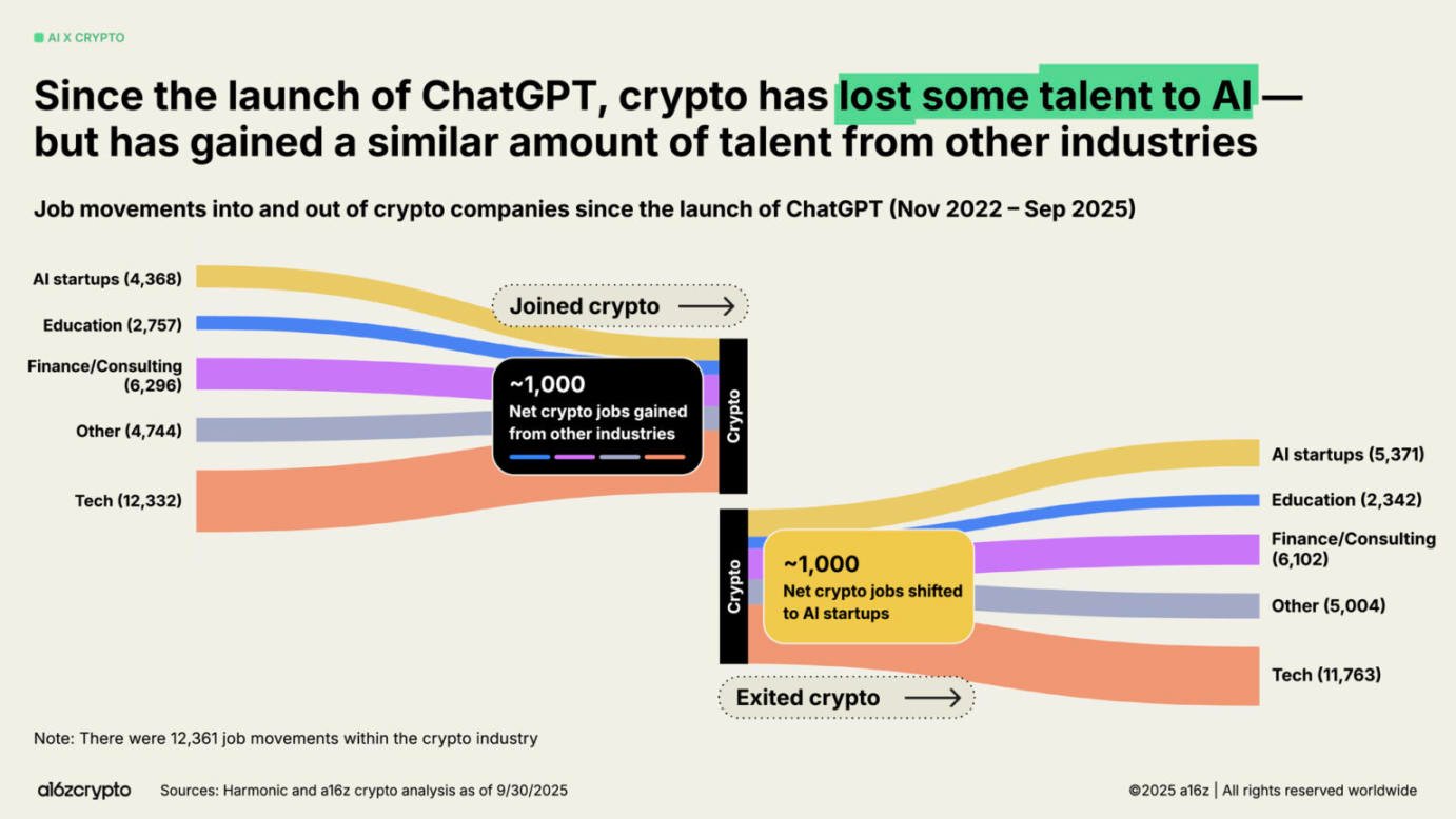 在人工智能热潮的带动下,一些开发者放弃了加密货币领域。我们的分析表明,自 ChatGPT 推出以来,约有 1,000 个工作岗位从加密货币领域转向了人工智能。但这一数字被同样数量的开发者从其他领域(例如传统金融和科技)加入加密货币领域所抵消。
