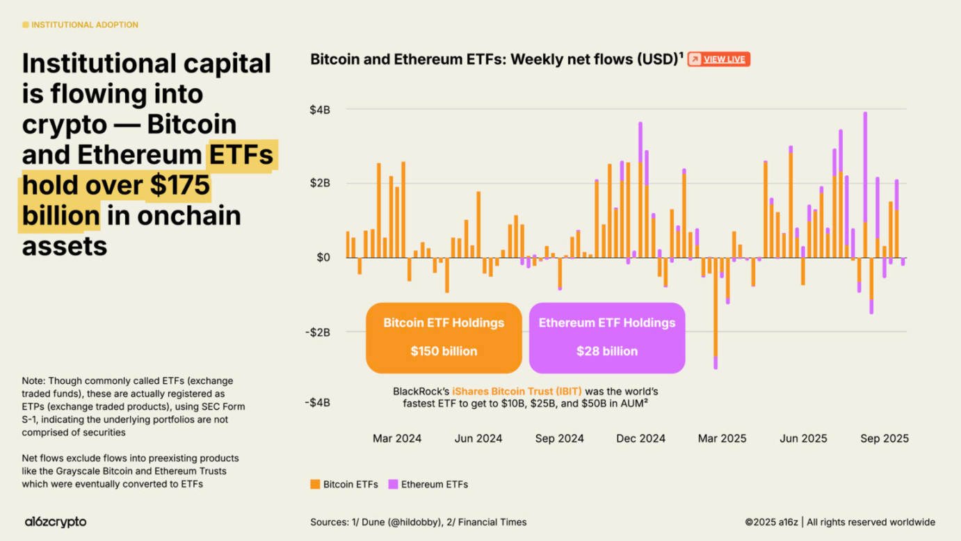 交易所交易产品是机构投资采用的另一个关键驱动力,目前链上加密货币持有量超过 1750 亿美元,较一年前的 650 亿美元增长了 169%。