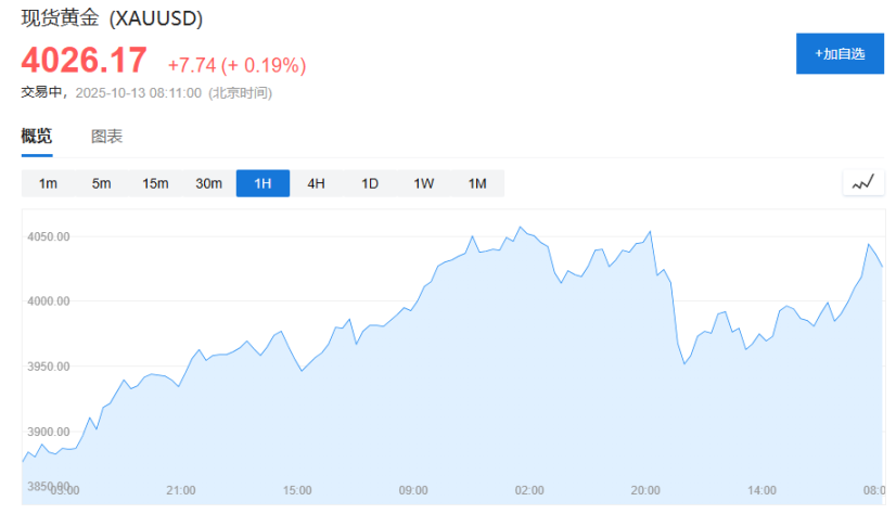 作为避险资产的黄金延续涨势,截至发稿,现货黄金上涨 0.19%,至每盎司 4026.17 美元。