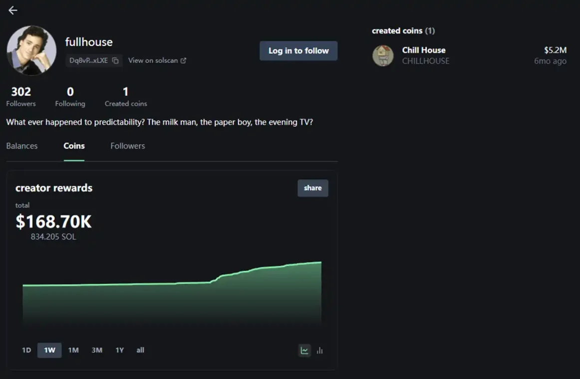 这笔创作者收入还是自 7 月 20 日以来累积的,因为现在负责运营 Chillhouse 官推的是 @RiccoRosas,创作者收入在 7 月末时重定向到了他手上。所以也可以说,Chillhouse 是 pump.fun 创作者收入改革后最成功的案例,保障了 meme 币的长期运营。