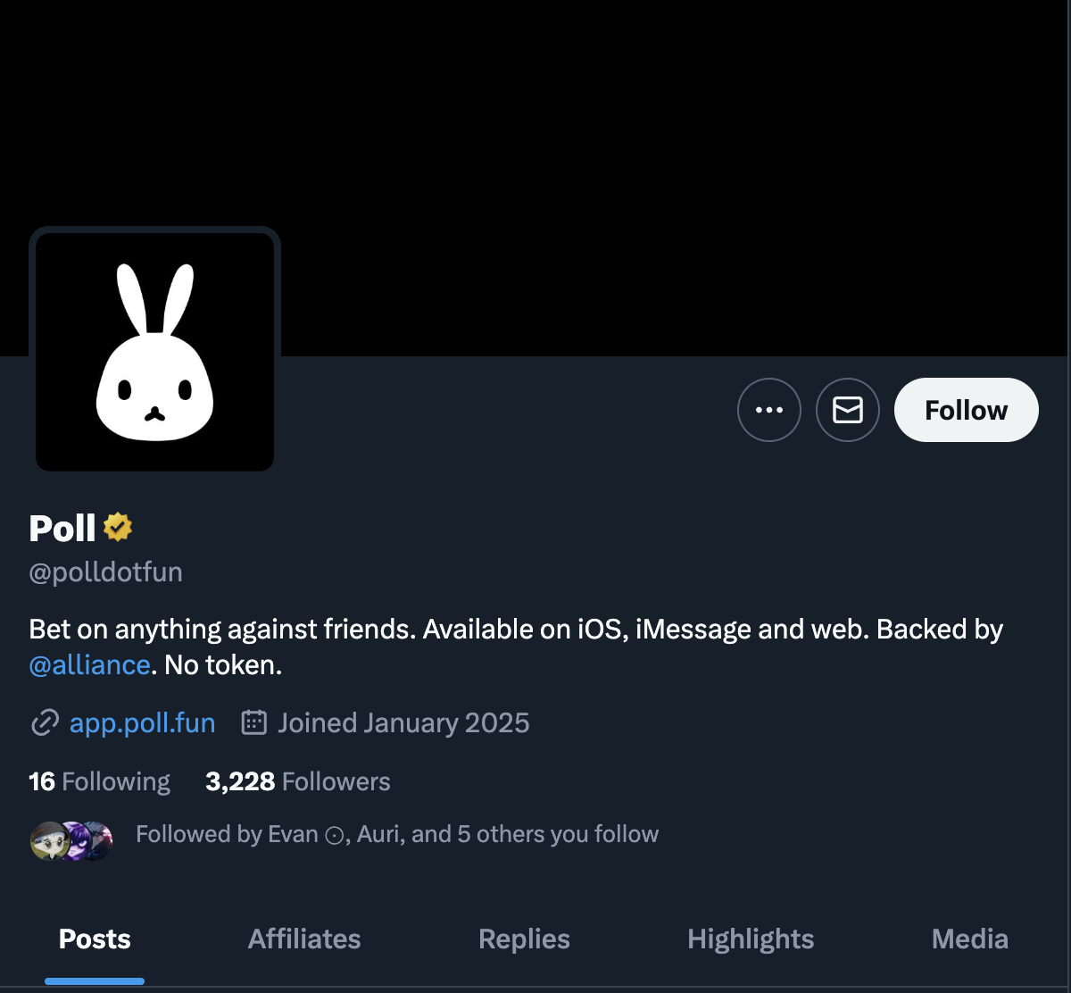 Poll 是一个社交投注(wagering)平台,专注于让用户与朋友、家人或同事在聊天中轻松下注任何事情(如比赛结果、预测事件或随意话题),将“空谈”转化为实际行动。
