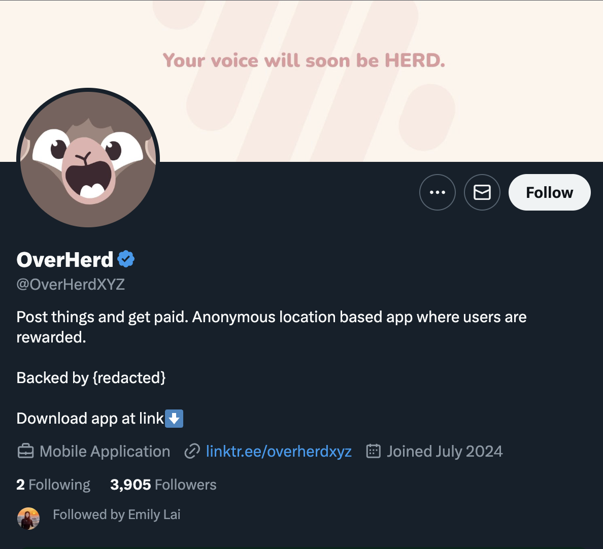 作为一个基于Web3的匿名社交应用,OverHerd 的一大亮点是基于 Web3 基础设施运行的 Web2 应用,日活用户达 20,000。主要聚焦位置(本地社区)和兴趣小组连接。用户可以匿名发布内容(如“takes”或观点),内容质量高的帖子会浮上热门。