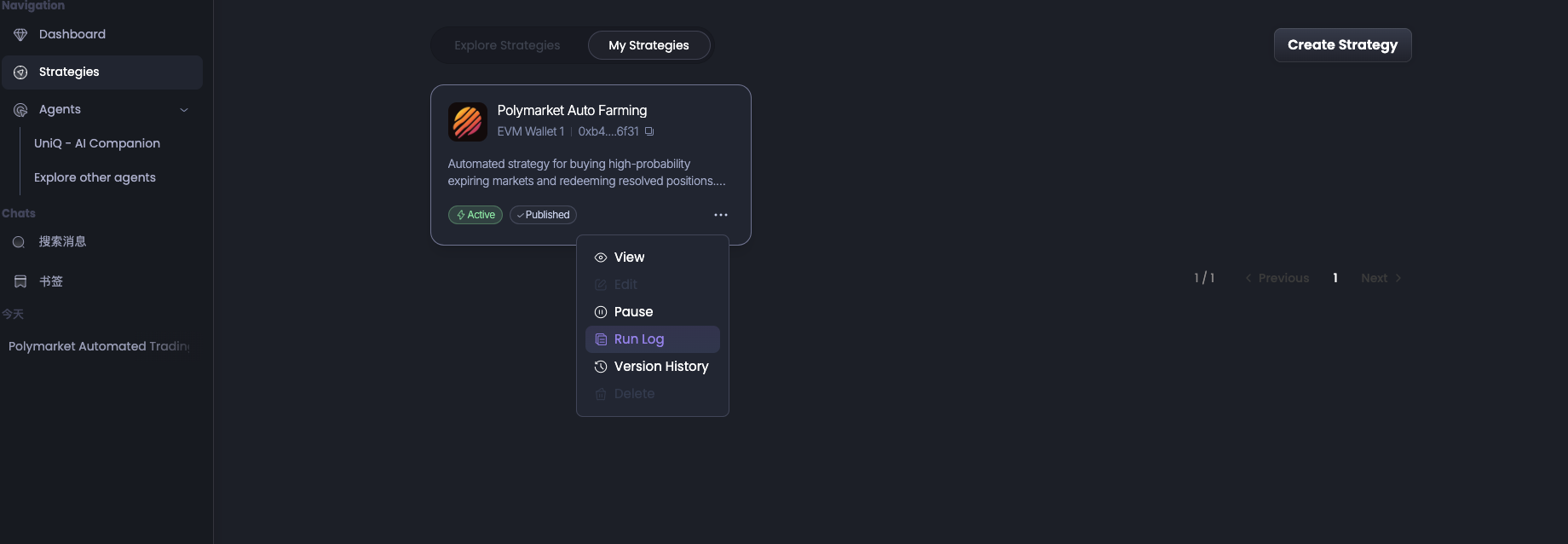 在「Strategies」页面再点击「My Stratrgies」便可以看到目前正在运行的代理。同时,用户也可在此次选择停止该策略,或者点击「Run Log」查看策略执行日志。