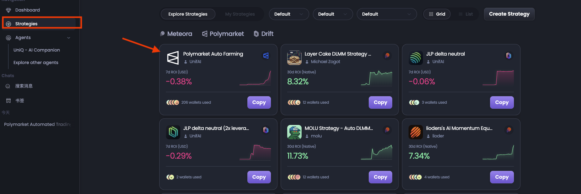 运行这个策略的操作很简单,首先使用 Telegram 账户登录 UnifAI 官网,点击「Strategies」后再点击进入「Polymarket Auto Farming」策略代理。