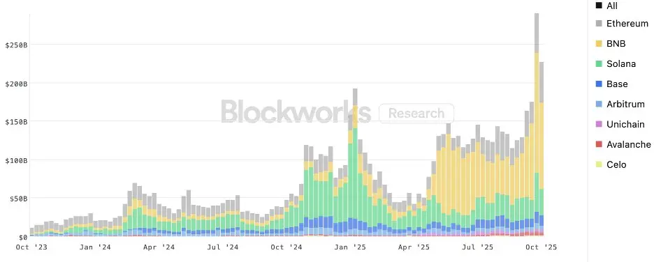 一个很有前景的例子是,在 2025 年年中,币安推出了 Binance Alpha,一个流动性激励和建设者计划,引发了链上 DEX 活动的急剧增加。BNB Chain 的 DEX 交易量曾短暂超过链上现货总交易量的 70%,展示了生态系统潜在用户和开发者参与的深度。