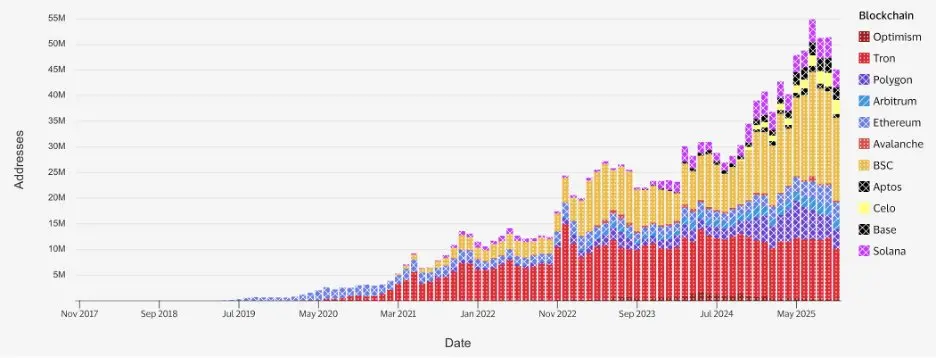 图片 10:BNB Chain(BSC)在过去 5 年活跃的稳定币钱包数量上领先且增长最快
