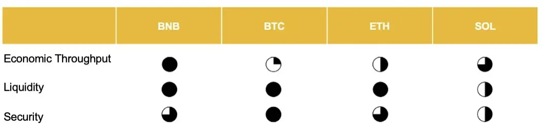 根据我们的经验,大多数系统都会为了一个维度而牺牲另一个维度——安全性更高的网络通常会牺牲经济吞吐量。BNB 的架构,通过权益权威证明 (PoSA) 共识和深度的多场所接入,旨在近乎平衡地维持这三个维度。