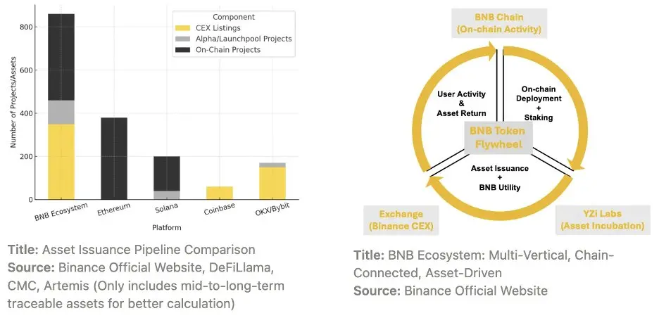 BNB 生态系统通过其支持性风险投资伙伴(如 YZi Labs),为资产发行提供了一个强大、高效且全面的平台。这些风险投资伙伴处于战略位置,能够从最初的概念验证阶段开始引入投资项目,引导这些项目完成融资和初始分发,并随后通过 BNB Chain 促进这些项目的全球交易和去中心化生态系统增长。通过确保建立表现顶级的交易对 (通过 CEX),BNB 正在成为一个强大且或许是 Web3 领域最有效的全周期资产发行中心之一。
