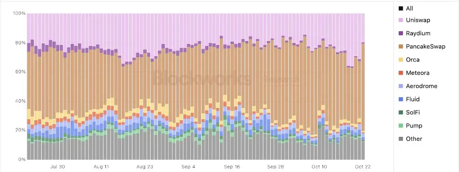 图片 2:根据 Blockworks Research 数据,BNB Chain 的 DEX 现货市场份额在所有 DEX 中最大