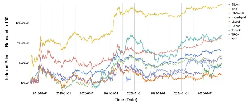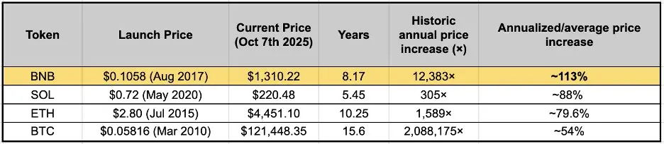 在支持数字资产信托 (DAT) 的 Layer-1 代币中,BNB 展现了非常强劲且经周期验证的表现,其年化价格涨幅一度高达约 113%,超过了 ETH、BTC 和 SOL (数据来源见正文)。对于机构投资组合而言,BNB 有望提供结构性脱钩和非对称的上行潜力。它能增强多元化,并提升多资产策略中的风险调整后价值收益。