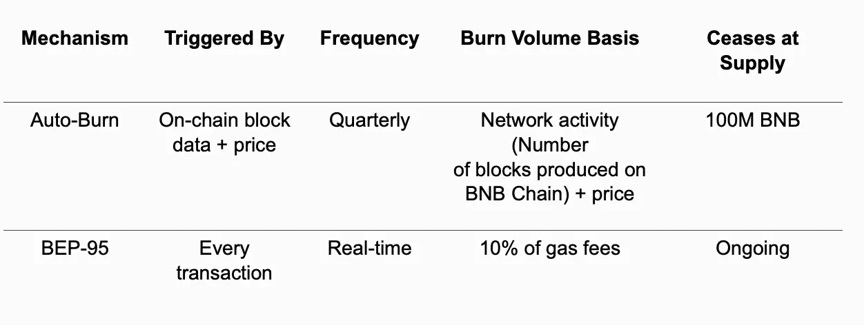 BNB 是程序化自平衡的。它在一个程序化设定的 1 亿代币上限下运行,由两个互补的机制——自动销毁 (Auto-Burn) 和 BEP-95——进行管理,这两个机制会根据活动和价值流动,按季度和实时减少流通供应量。