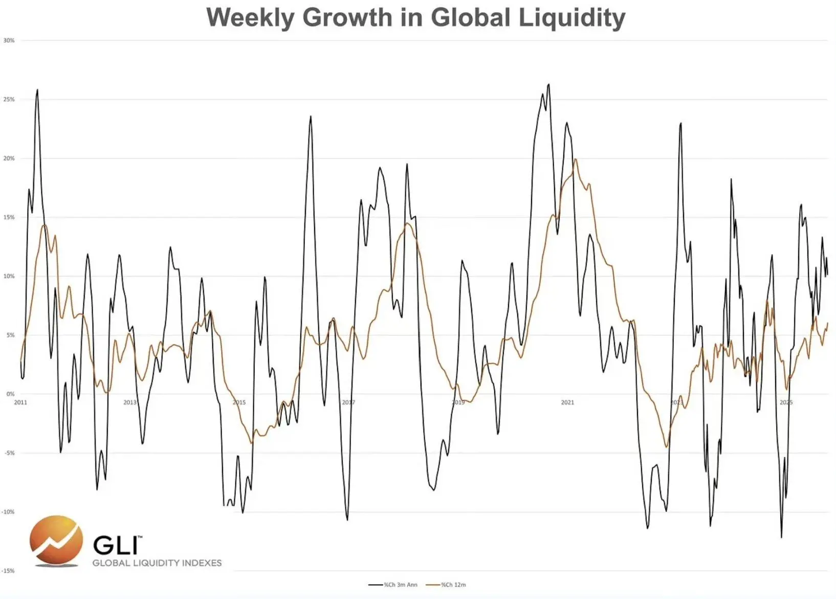 根据 Global Liquidity Indexes 的研究:「历史数据显示,流动性变化往往会引发风险资产价格变化,滞后期约为 3 个月。具体而言,全球流动性增加后,风险资产通常会表现向好;而流动性减少则往往预示着资产价格走势疲软。」