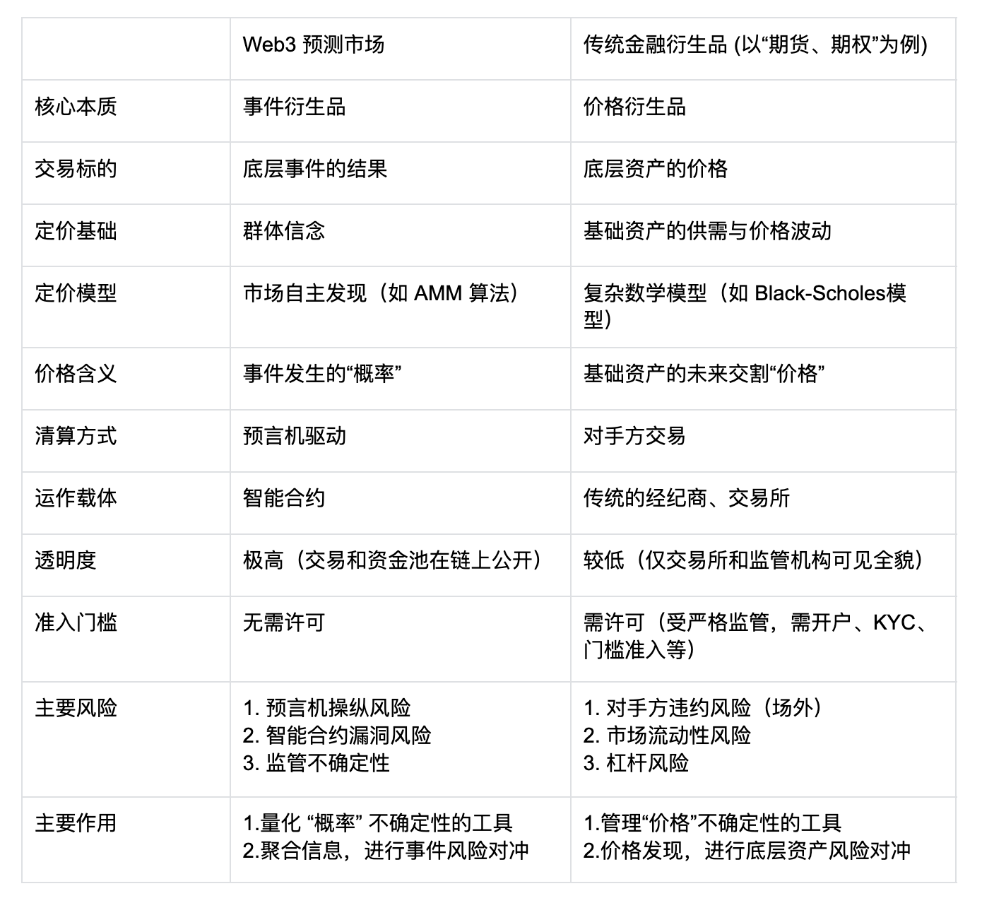 在 Web3 的加持下,这种差异被进一步放大。传统衍生品依赖 Black-Scholes 等复杂数学模型定价,并通过经纪商和中心化交易所清算;而链上预测市场则通过智能合约自动执行,依靠预言机(Oracle)驱动清算,其定价(如 AMM 算法)和资金池在链上完全透明。这极大地降低了准入门槛,但也带来了新的风险(如预言机操纵和合约漏洞),这与传统金融的对手方风险和杠杆风险形成了鲜明对比。
