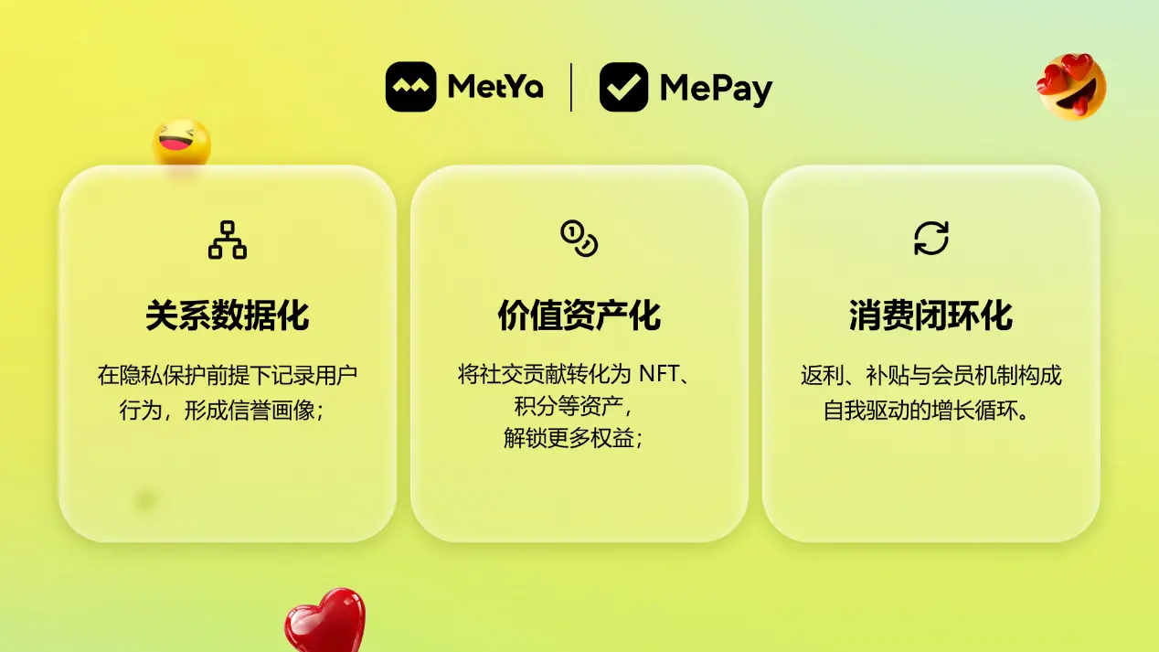 它让用户在社交互动中积累的价值无缝转化为可消费的资产,通过高效、透明的支付机制,推动 Web3 应用真正融入日常生活。MePay 不仅延续了 Metya 的核心理念,还通过产品迭代与数据沉淀,进一步强化了平台的竞争力与可持续性。