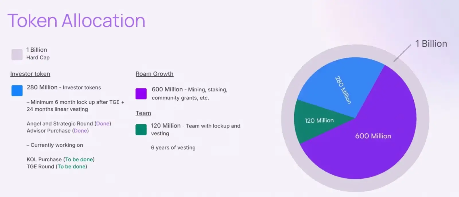 根据链上数据,约95%的$ROAM供应处于非流动状态,交易所余额仅占~4.4%。代币经济模型设计上,团队分配(12%)设定了6年线性释放,挖矿部分(60%)采用指数衰减模型释放,这些机制从源头上限制了流通供应,并激励长期网络参与。