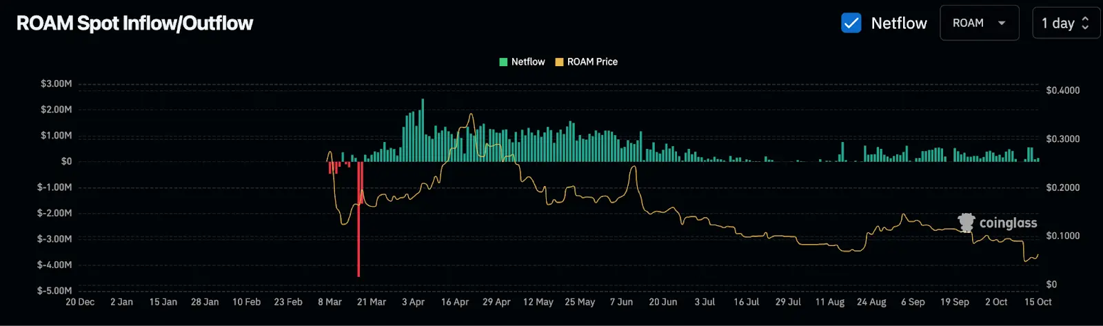 根据 Coinglass 的 Roam Spot Inflow/Outflow 图表截止10 月 15 日的数据,