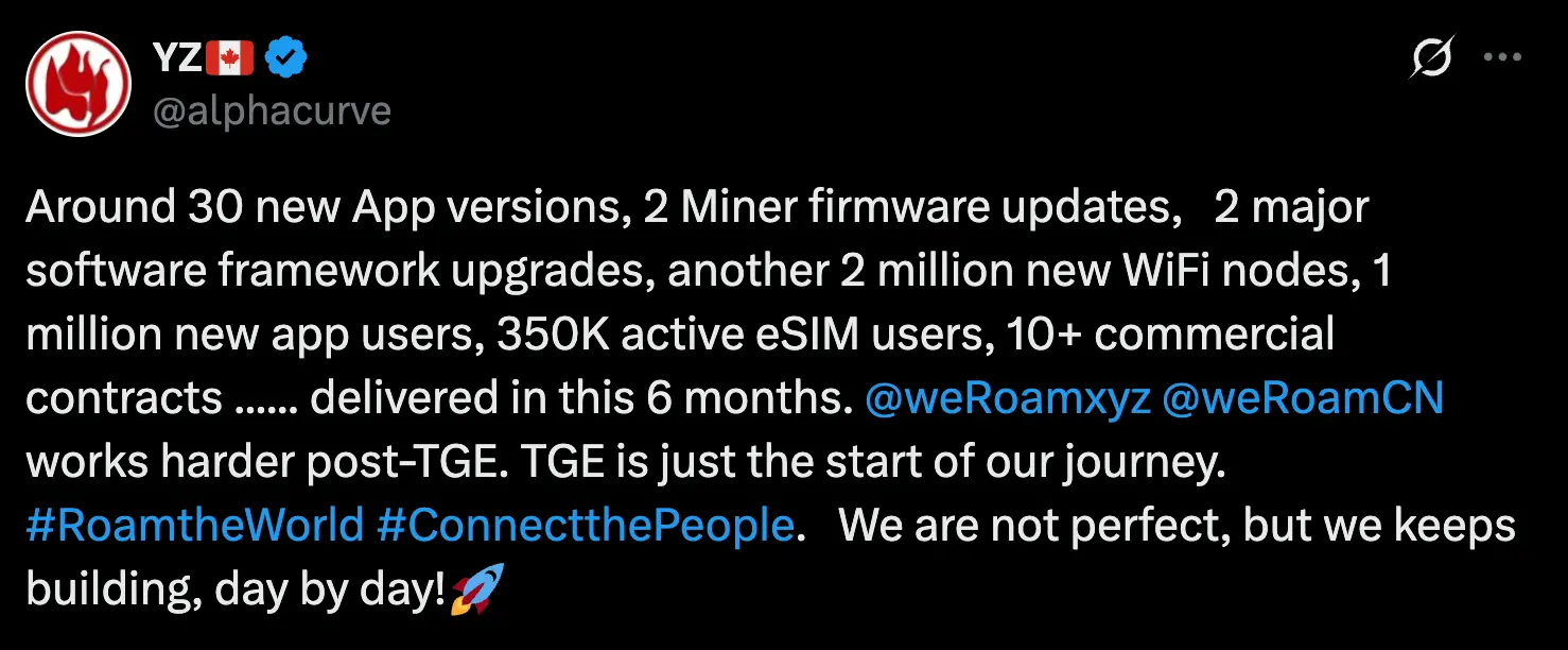 (Roam 联创 YZ 发推回顾 TGE 后团队建设历程:30 个版本更新,2 次硬件升级,2 次重大软件架构升级,200 万新增 WiFi节点,100 万新增注册用户,35 万 eSIM 活跃用户,10 份商务合同签署......TGE 只是开始。来源:X)