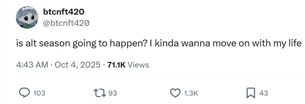 如果你还在疑惑为什么 Crypto Twitter 上大多数人都情绪低落,那么看看这一事实:目前排名前 50 的山寨币价格,已经跌破了 2022 年 FTX 崩盘之后的水平(数据来源于 @VentureCoinist)。