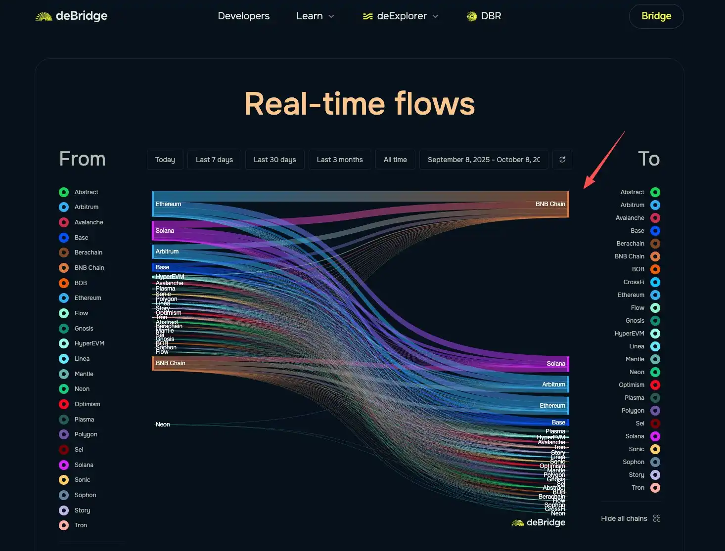 据 DeFillama 数据显示,BSC 网络过去 24 小时费用达 557 万美元,排名公链第一。Tron 网络(146 万美元)排名第二,以太坊网络(120 万美元)排名第三。并且从全网资金流动情况来看,BSC 已经出现了资金虹吸效应。