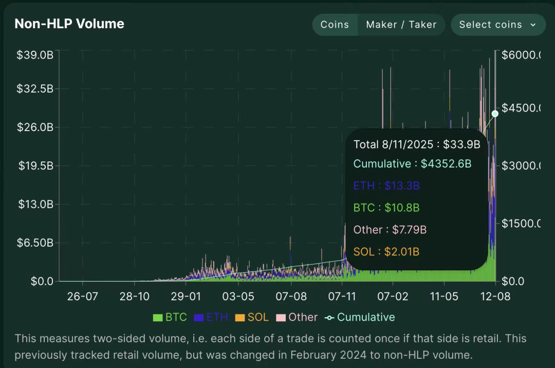 采用非 HLP 交易量指标(累计 4.3 万亿美元)来分析,由于 HLP 是被动流动性提供者/平台资金池,负责内部化订流和对冲风险,因此非 HLP 交易量代表了用户对用户(Peer-to-Peer)的交易流。需要留意的是,这部分用户间交易流仍包括: