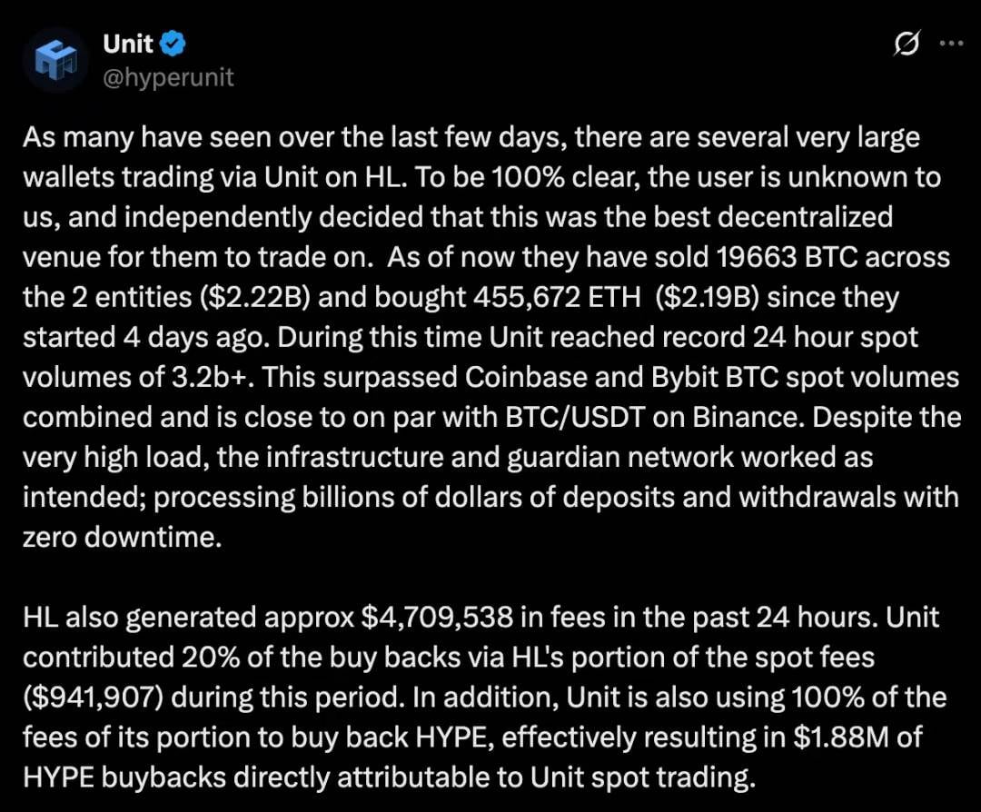 Unit 项目通过提供更原生的现货交易体验,有力地推动了 HIP-2 的采用。本质上,Unit 是一个多签钱包,它允许交易者索引原生链并在 Hyperliquid 上进行无需许可的交易。