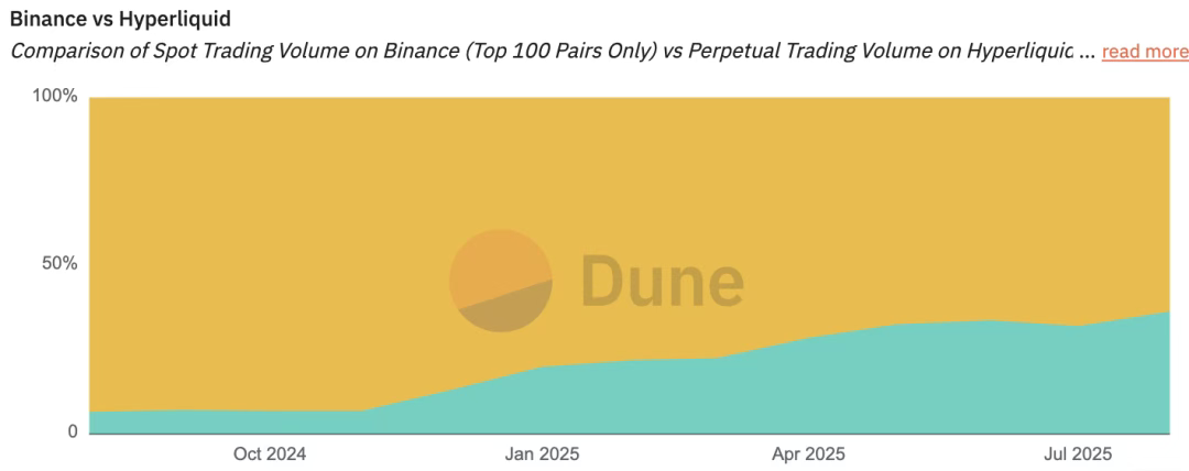然而,将现货交易量与永续合约交易量直接比较,就像比较苹果和橘子。如果我们想要清晰区分币安(Binance)和Hyperliquid(HL)在现货与永续合约市场的实际份额,可以看到以下情况: