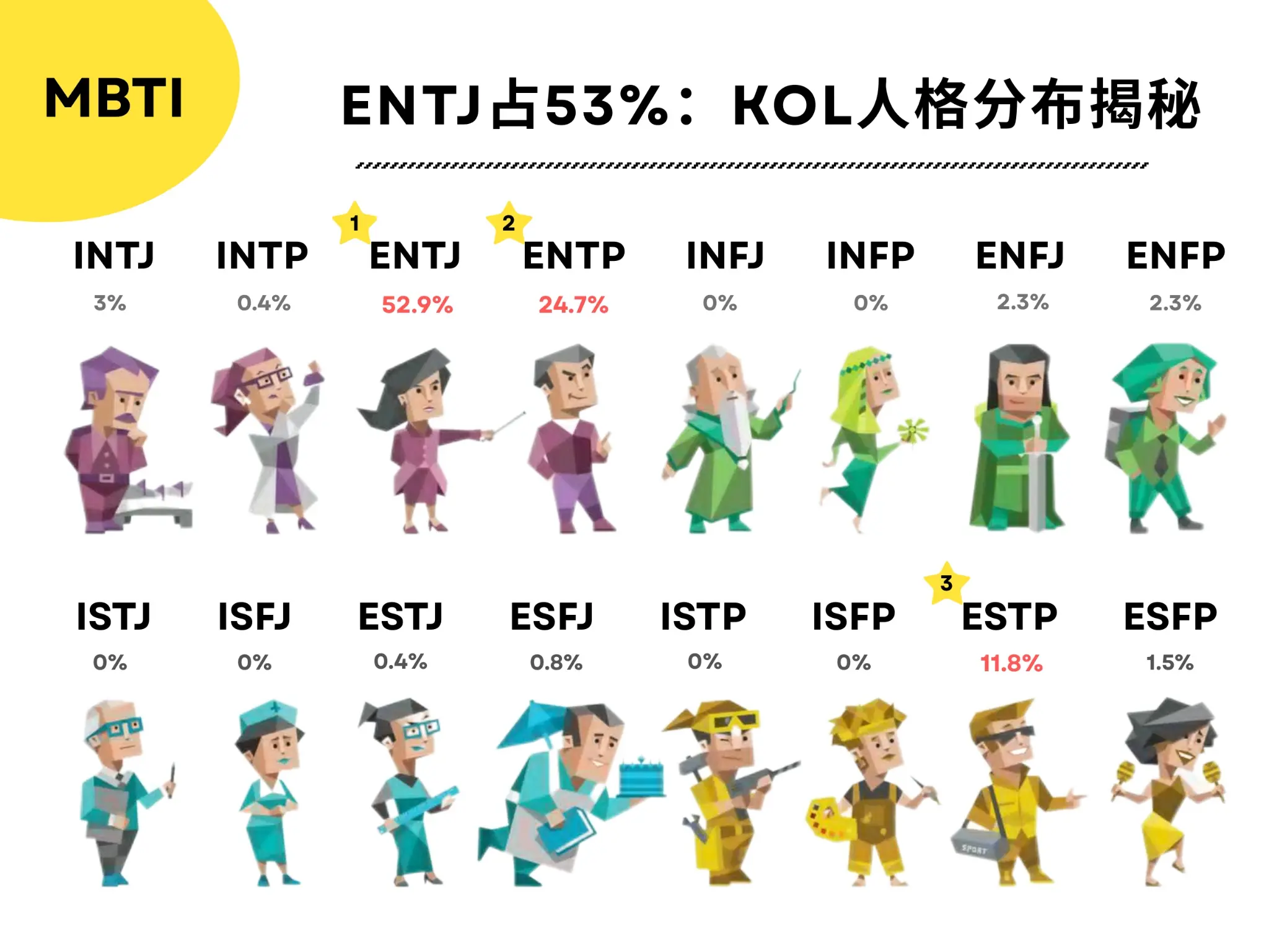 MBTI人格类型分析显示,这是一个由ENTJ(指挥官,52.9%) 主导的群体,这类人格以目标导向、善于规划和掌控局面著称,符合 KOL 在叙事构建与市场引领中的角色定位;
