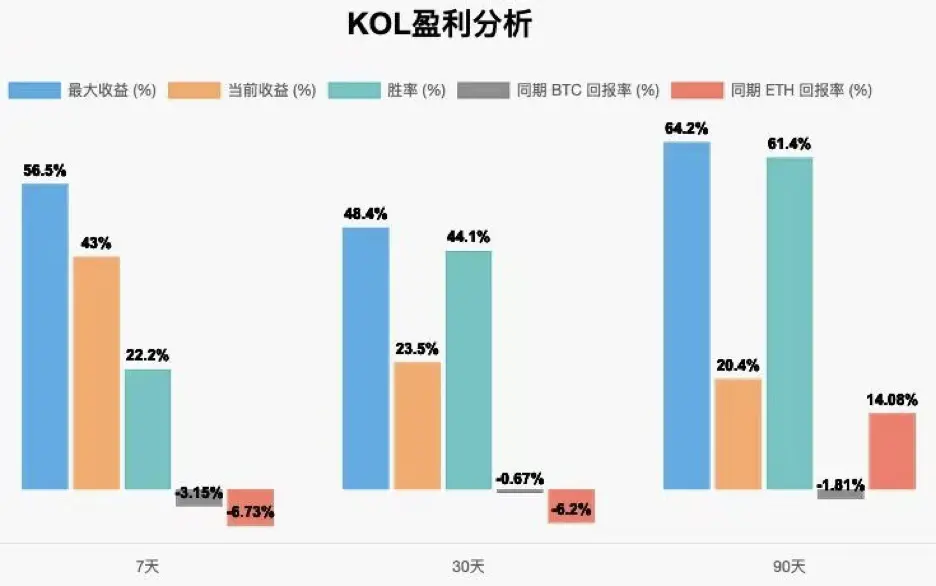 *KOL 盈利能力分析是以KOL在某个时间期限内第一次X发帖分析看好某个代币的时间点的代币价格作为买入价。最大收益率指在发帖后,相应时间段内代币最高价除以第一次发帖时候代币的价格。目前收益率指当前代币价格除以第一次发帖时候代币的价格。