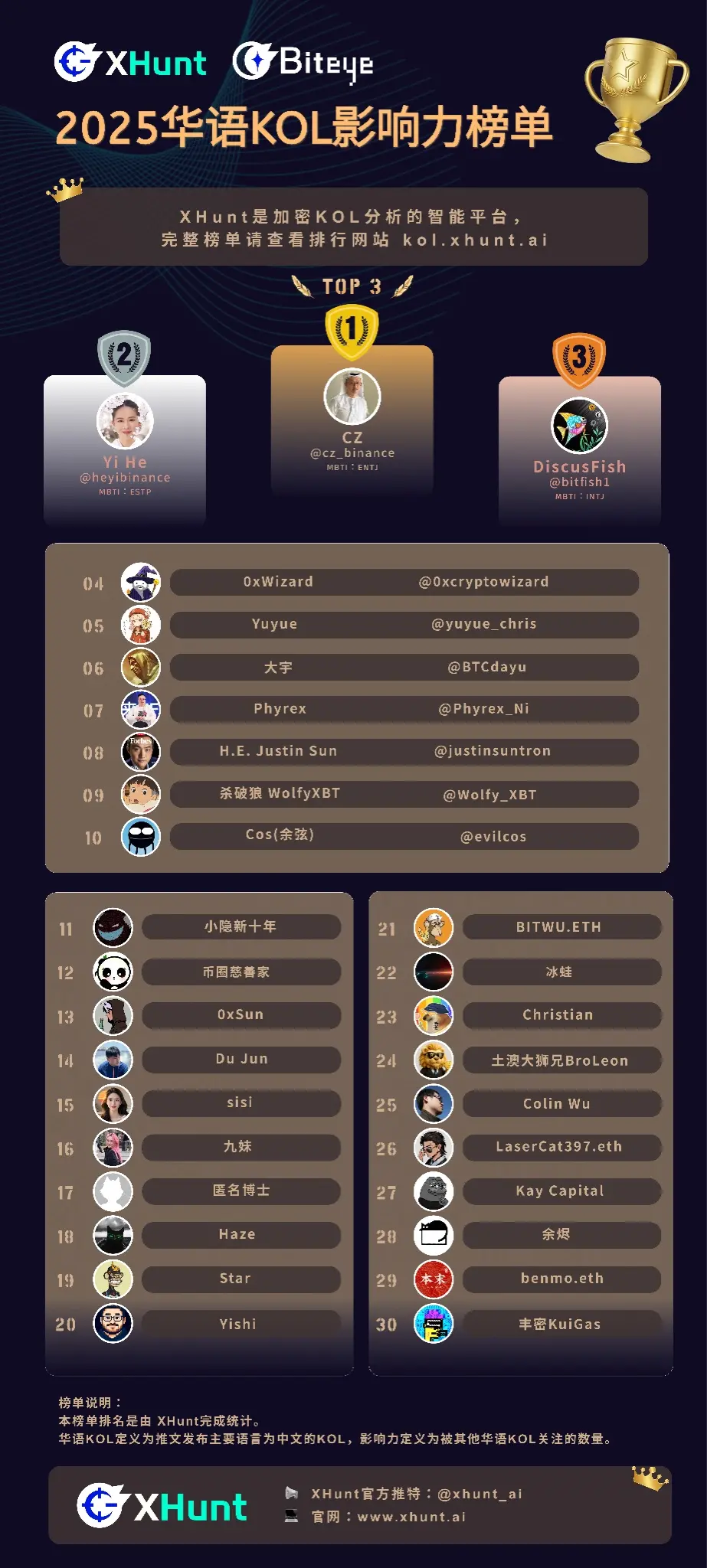 因篇幅所限,大量优秀 KOL 未能尽录,完整榜单请访问:kol.xhunt.ai
