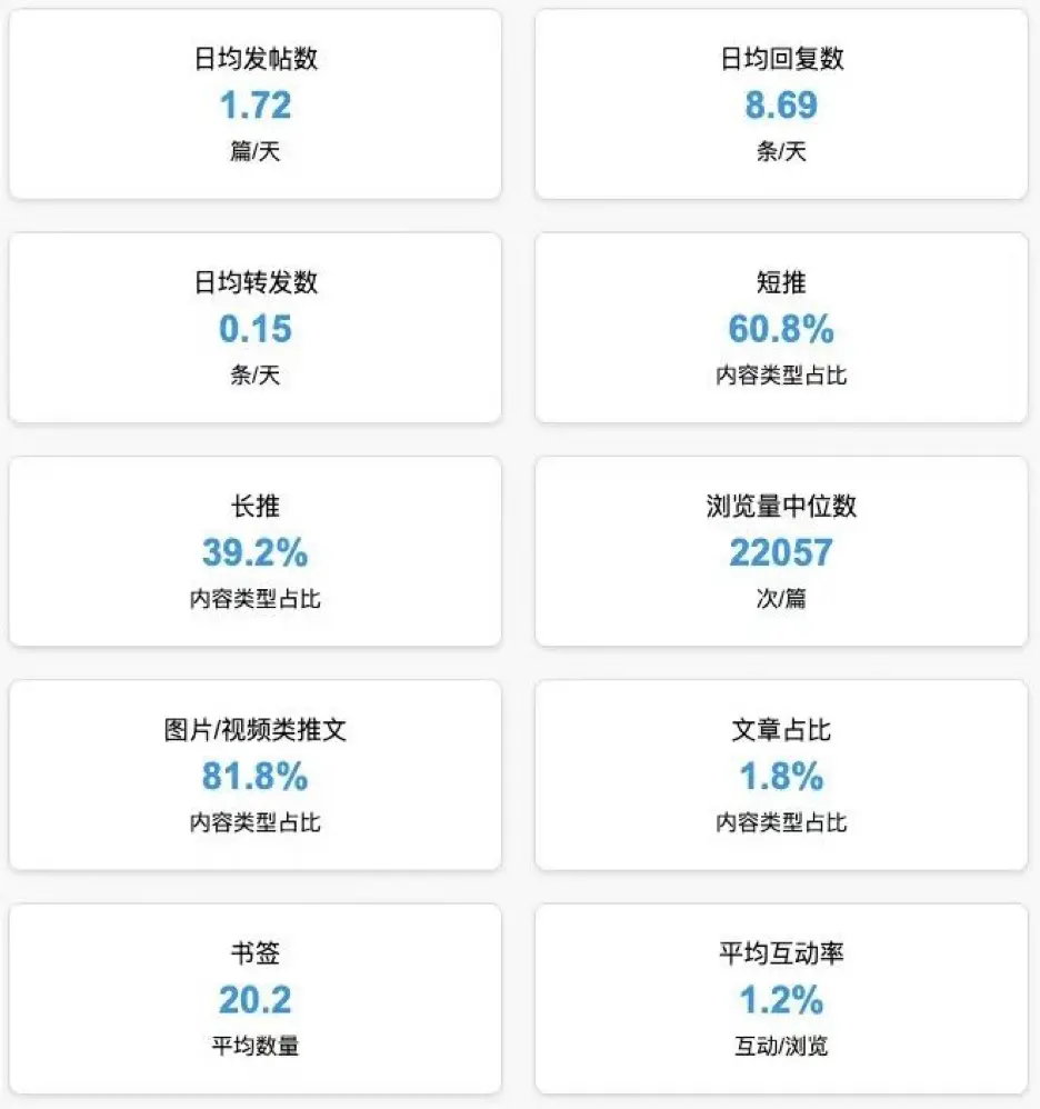 从传播效果来看,单条推文浏览量中位数达 22,507,具备较强触达力;此外,平均每条推文获得 20.2 次书签收藏,说明其信息价值被认可并被用于后续参考。