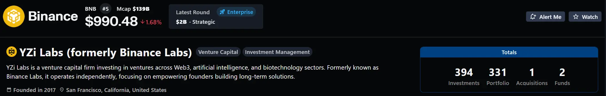 但问题在于,根据数据平台 Messari 的第三方统计,YZi Labs(Binance Labs)自成立以来,累计投资(或布局)项目已超 300 个,显然,单纯以「被投过」作为筛选标准,基本等于闭眼撒网,毫无意义。