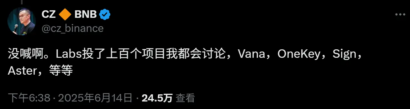- 6 月 14 日,CZ 在回应社区关于其「喊单 Aster」的质疑时,就点名了一批已投项目,包括 Vana、OneKey、Sign、Aster 等,埋下伏笔;