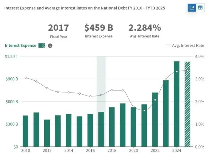 对美国长期债券需求的减弱对美国经济产生重大影响。美国财政部必须提供更高的利率来吸引投资者,这反过来又增加了美国政府必须支付的国债利息。如今,美国的利息支付接近每年一万亿美元,超过了整个国家的军事预算。